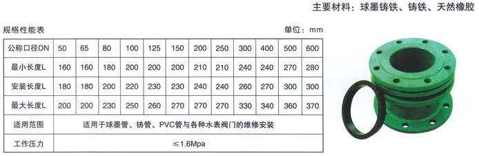柔性伸縮器可為城鎮(zhèn)自來水塔、泵房、水表及閥門安裝拆換提供的方便,以及對(duì)長(zhǎng)距離管道因溫差引起的伸縮問題,起到了良好的填補(bǔ)作用,代替了U型管。套管式伸縮器產(chǎn)品可用于給排水工程方面,用于熱力工程方面的,一般溫度按250℃,壓力按1.6MPa出廠。同時(shí)也可根據(jù)用戶的需求而生產(chǎn)參數(shù)系列的產(chǎn)品,以滿足于煤氣、石油、化工、水電等領(lǐng)域,其連接形式有:雙盤式、插盤式、承盤式;法蘭連接尺寸按現(xiàn)行 標(biāo)準(zhǔn),可按用戶要求加防拉脫限位螺栓。