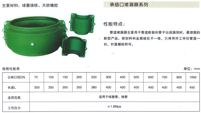 堵漏器是一種管道用的管道堵漏器,又稱卡復(fù)節(jié),由對(duì)稱的兩部分卡復(fù)體、卡復(fù)壓蘭、密封環(huán)、密封條、緊固件組成,卡復(fù)體內(nèi)腔、外部呈V形,卡復(fù)體口腔法蘭和壓蘭連接處采用凹凸形加密封環(huán)相銜接,上、下卡復(fù)體銜接處采用密封條密封,并由螺栓、螺母緊固為一體,其結(jié)構(gòu)簡(jiǎn)單,使用方便,可廣泛應(yīng)用于給排水和各種液體、氣體、壓力管道的沙眼、氣孔、橫向、縱向斷裂造成的漏水漏氣事故,省工、省時(shí)、節(jié)約費(fèi)用。